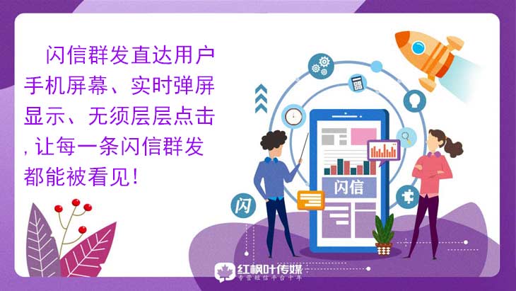 紅楓葉閃信群發(fā)79元起充、每條僅需幾分錢、高性價比、按需付費、24小時發(fā)送、快速實現(xiàn)商用。未來已來,紅楓葉閃信群發(fā)業(yè)務喚醒商機,讓閃信群發(fā)帶著品牌飛,紅楓葉閃信群發(fā)平臺、海量名企的選擇,十年通信技術服務及經(jīng)驗,無延時,秒級觸達,99%以上閃信5秒內觸達,閃信群發(fā)平臺紅楓葉傳媒